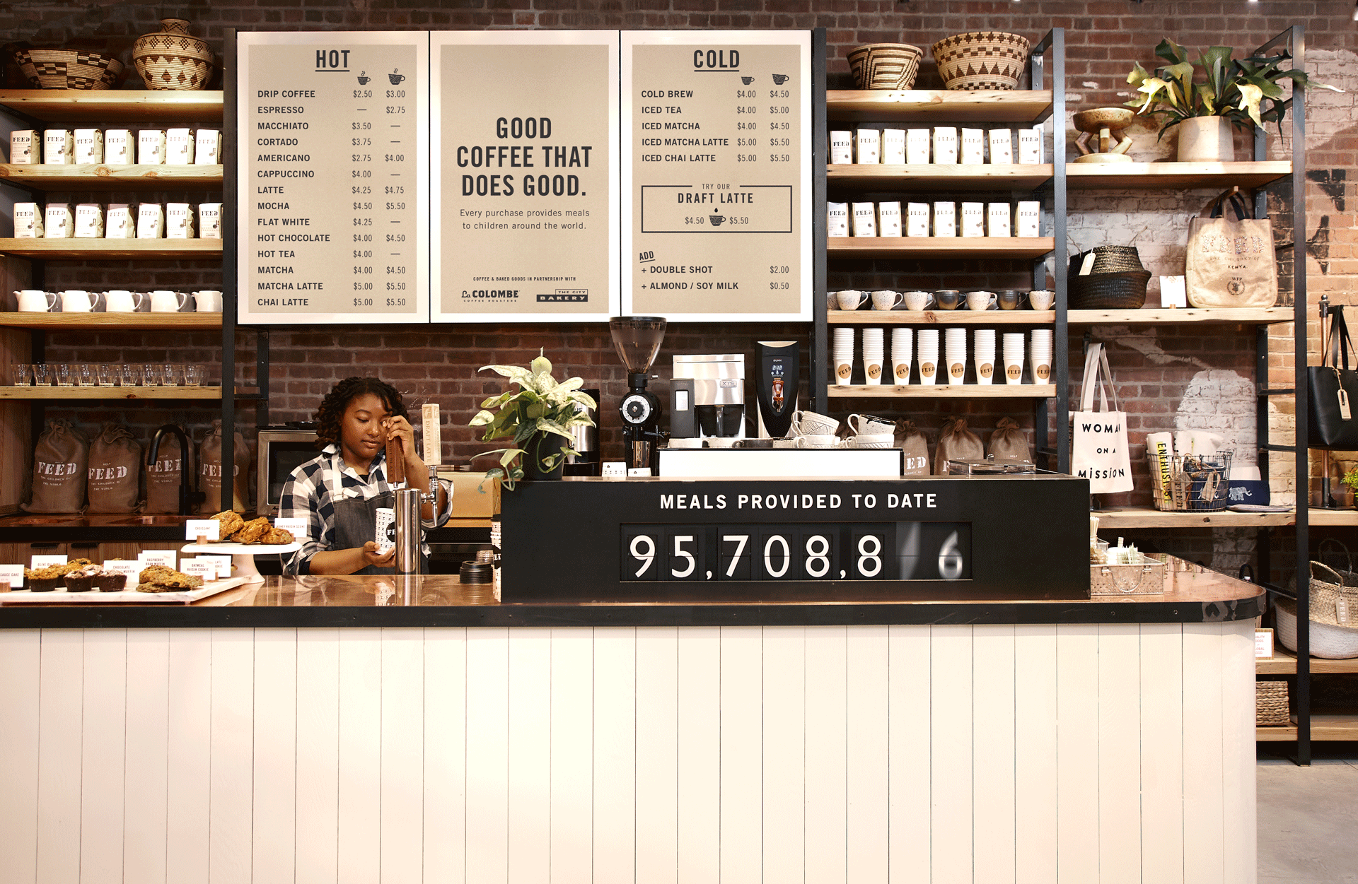 The FEED Shop & Cafe was designed to be a communal space for gathering, coffee & shopping—all whilst helping provide school meals with every transaction.